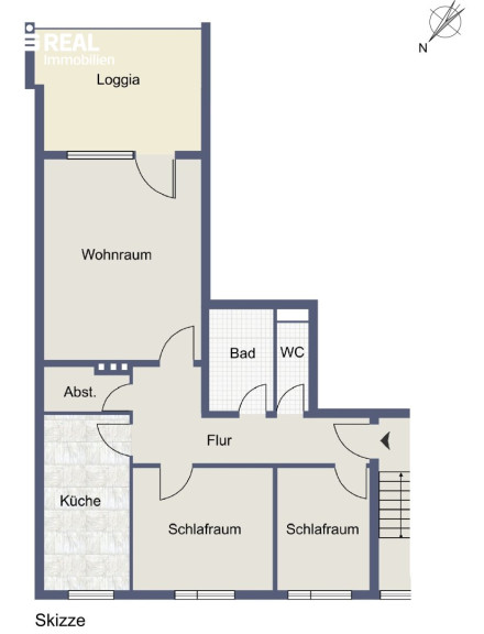 Innen teilt sich die Wohnung in zwei Schlafzimmer, ein Wohnzimmer mit Loggiazugang, eine Küche mit Platz für den Essbereich, dazu Bad, Gäste-WC und einen praktischen Abstellraum. Die Wohnung bietet eine ideale Basis, um eigene Ideen umzusetzen und sie nach dem persönlichen Stil zu gestalten.