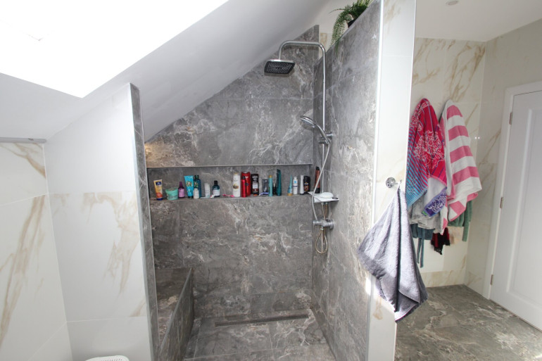 Hier befinden sich 3 Schlafräume, ein Schrankraum und ein geräumiges Badezimmer mit einer großen Dusche, einem Waschtisch, sowie einem weiteren WC.