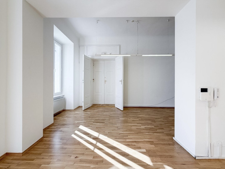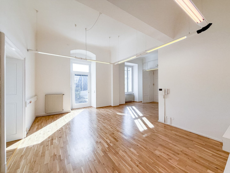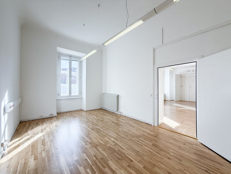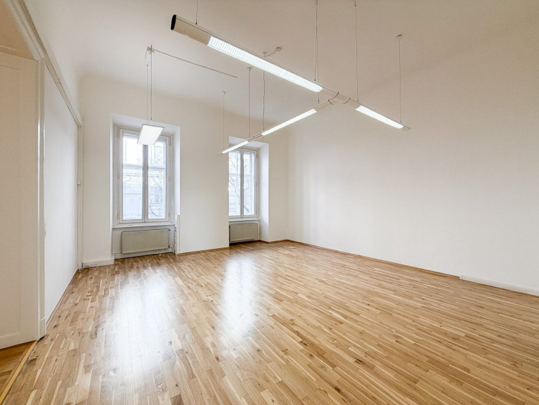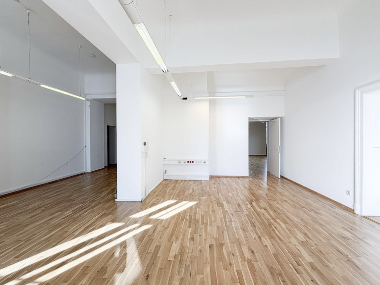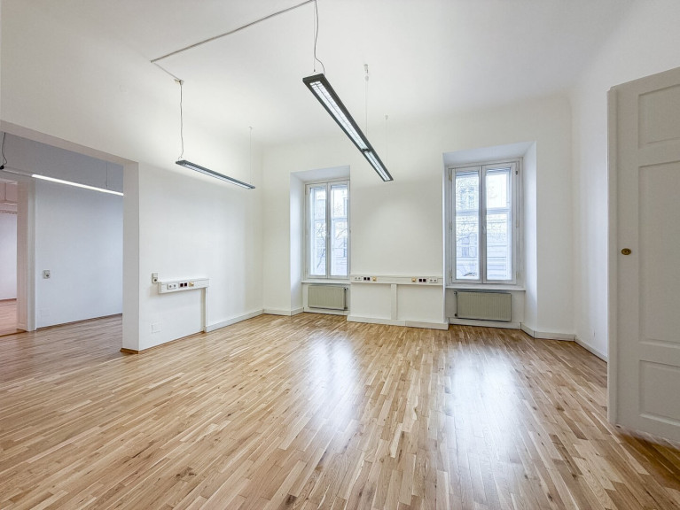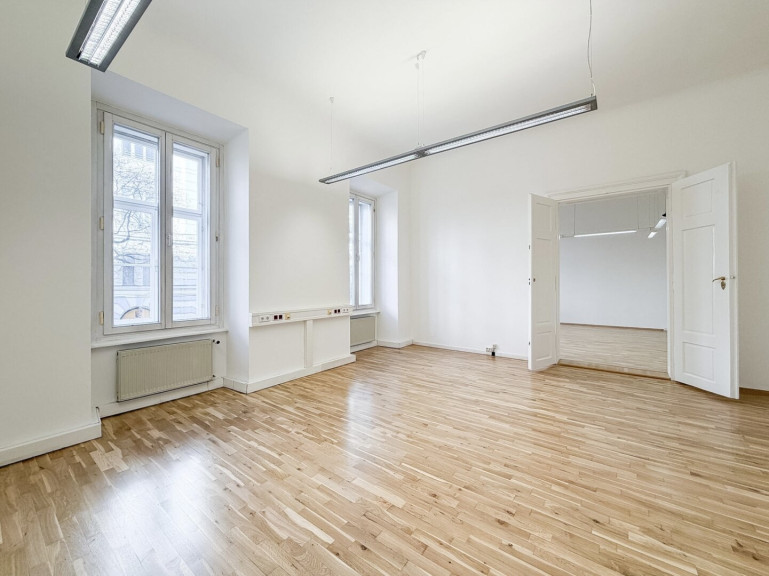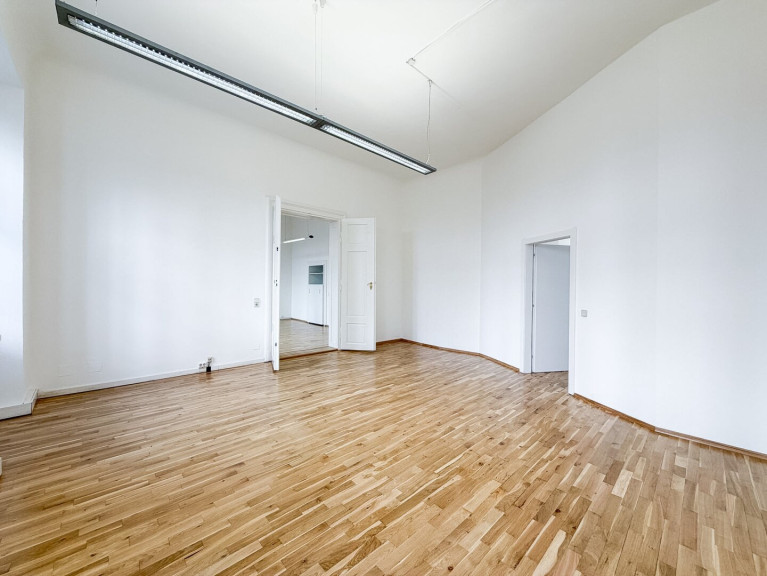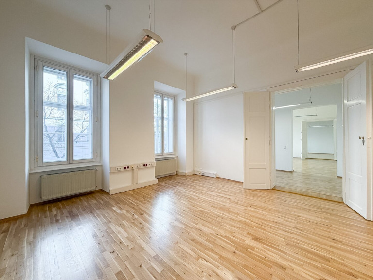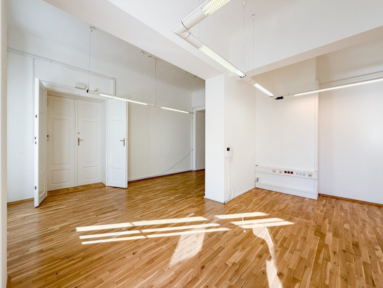 Die Bürofläche erstreckt sich über die komplette erste Etage (mit Lift) und verfügt über einen Balkon in Richtung des ruhigen Innenhofs (Südausrichtung). Neben 6 großzügigen Räumen verfügt die Immobilie über einen Vorraum, einen Küchenbereich sowie drei einzelne WCs. Dank der großzügigen Fensterflächen in Kombination mit der altbautypischen Raumhöhe genießen Sie eine lichtdurchflutete Atmosphäre. Die Räumlichkeiten befinden sich in ausgezeichnetem Zustand mit frisch gestrichenen Wänden und neu aufbereitetem Parkett.