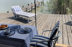 Das wunderschöne Ferienhaus liegt in absoluter Ruhelage am offenen See, nahe der Ruster Bucht in Richtung Oggau und ist vom Hafen über eine ca. 15-minütigen Bootsfahrt – entweder über Kanäle oder mittels Bootsfahrt über die Ruster Bucht erreichbar. Die ruhig gelegene Seeliegenschaft bezaubert durch die beeindruckende Aussicht - nicht nur vom Plateau (Terrasse), sonder auch vom Wohnraum, der sich über ein großflächiges Fenster in Richtung Süd-Ost orientiert.Beschreibung der Immobilie