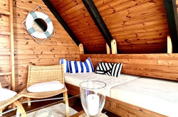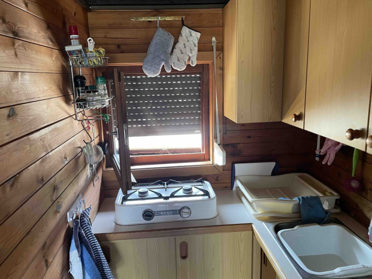 Die Seehütte wird inklusive dem vorhandenen gepflegten Inventars übergeben. Durch die große Terrassentür betritt man einen geräumigen, gemütlichen Wohnraum, in dem sich ein Sofa befindet, das auch als Bett für zwei Personen verwendet werden kann. Ein formschöner Vollholz-Schrank bietet praktischen Stauraum.