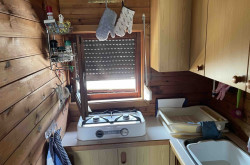 Vom Wohnraum erreicht man einen Gang mit Garderobe, das WC und über einen offenen Durchgang die Küchennische, die Badnische und einen Schlafraum für 2 Personen.