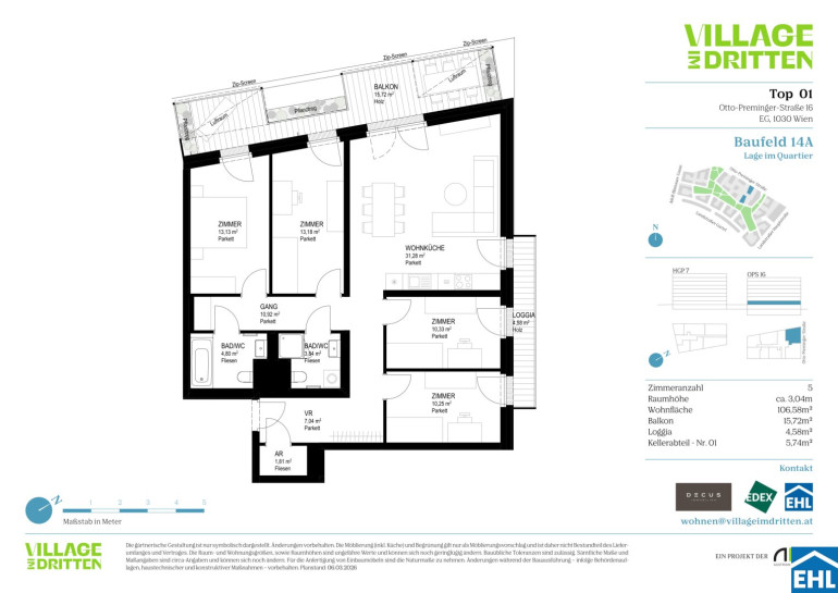 Im dritten Wiener Gemeindebezirk entsteht mit dem VILLAGE IM DRITTEN ein neues Stück Stadt – eines der größten Stadtentwicklungsgebiete Wiens. Auf über elf Hektar entwickelt die ARE Austrian Real Estate gemeinsam mit der Stadt Wien und dem wohnfonds_wien ein lebendiges, nahezu autofreies Quartier mit rund 2.000 Wohnungen, Büro- und Gewerbeflächen, Kinderbetreuung, Bildungseinrichtungen und Nahversorgung. Das grüne Herz bildet der über 2 Hektar große Bert-Brecht-Park –eine Oase für Erholung, Begegnung und Spiel. Alle Dächer, die nicht begehbar sind, werden begrünt. Sharing-Angebote, Einkaufsmöglichkeiten und Gastronomie liegen direkt vor der Haustüre. Nachhaltigkeit, kurze Wege und hohe Lebensqualität sind die Leitlinien dieses neuen Stadtviertels.