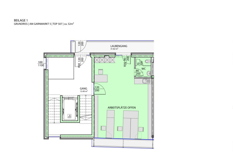 Die moderne und vielfältige Gestaltung, sowie die mittlerweile überregionale Bekanntheit der Dachmarke machen den Garnmarkt zu einem repräsentativen Standort für die dort ansässigen Unternehmen. Hinzu kommen die zentrale Lage und gute Erreichbarkeit. Das Areal bildet einen Teil des Ortszentrums mit einer idealen Infrastruktur, mit Parkplätzen, Grünflächen und einer guten Verkehrsanbindung. Geschäfte, Büros, Restaurants, Ordinationen, Kanzleien, Kinderbetreuungseinrichtung - alles ist an einem Ort und leicht erreichbar. Diese durchdachte Verknüpfung von Einzelhandel, Dienstleistung und Wohnen führt so zu einer Belebung des Standortes. Gerade für Mitarbeiter bedeutet ein Arbeitsplatz Am Garnmarkt ein Stück Lebensqualität, denn die Nähe zu den Geschäften ermöglicht einen spontanen Einkauf, eine überbetriebliche Kinderbetreuung sorgt sich um die Kleinen und die gestalteten Plätze laden zum Verweilen ein. Abschließend muss noch das vielfältige Gastronomie Angebot erwähnt werden. Diese Gewerbeimmobilie befindet sich über der Bibliothek und ist östlich ausgerichtet.Beschreibung der Immobilie