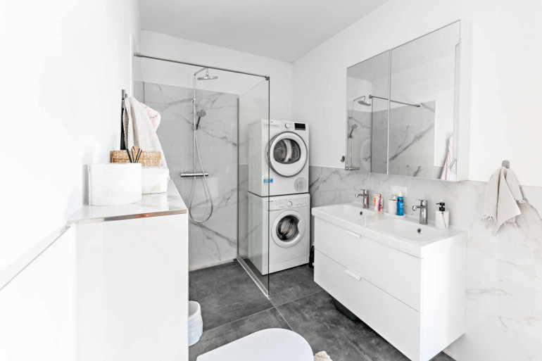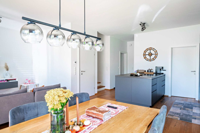 Die Ausstattung ist hochwertig und geschmackvoll gewählt: Eichenparkettböden, elegante Fliesen sowie moderne Badezimmer mit Dusche und Badewanne sorgen für Wohnkomfort auf hohem Niveau. Herzstück des Hauses ist die elegante, funktionale anthrazitfarbene Einbauküche, die durch eine angrenzende Speisekammer/Abstellraum praktisch ergänzt wird.
