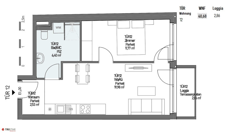 Top 7: WNFL ca. 41 m² (2 Zimmer) + LOGGIA ca. 3 m² + ER (Keller) ca. 2 m² RESERVIERT