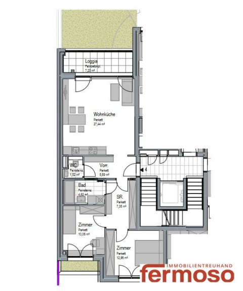 Die Loggia mit ihrem herrlichen Grünblick ist der ideale Rückzugsort, um die Seele baumeln zu lassen und die Natur direkt vor der Tür zu erleben. Stellen Sie sich vor, wie Sie bei einem Glas Wein den Sonnenuntergang genießen oder einfach nur die frische Luft schätzen.