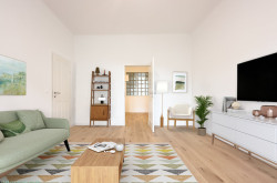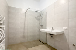 Kommen Sie hinein – gleich links geht es zur separaten Küche mit Durchgang zum gemütlichen und äußerst hellen Wohnzimmer. Von hier aus kommen Sie durch die Wohnzimmertür wieder zurück in den großzügigen Eingangsvorraum, mit Abstellraum für alles, was man so braucht – und daneben auch das WC. Gegenüber befindet sich das NEUE BAD – mit Regen- und Handdusche sowie einem großen Waschbecken. Hier können Sie sich im modernen Spiegel zurechtmachen und auch schon mal das Albrecht-Lächeln probieren. Die Zwischenwand von Bad und Schlafzimmer hat oben ein zusätzliches Glasfenster für mehr Tageslicht bekommen. Das sorgt für natürliches Licht im Spiegel – und dafür, dass Cremes und Pinsel den richtigen Weg finden. Klugerweise wurde auch ein Lichtfenster über dem Türrahmen zum Schlafzimmer eingebaut – auch das bringt mehr natürliches Südlicht in den Vorraum. Der Wohnungseingang liegt am äußeren Etagengang. Gut gewählte