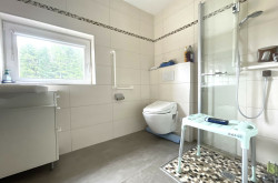 Im Obergeschoss finden Sie ein geräumiges Wohnzimmer mit großflächigen Glasfronten und Gartenblick, drei komfortable Schlafzimmer sowie ein weiteres Badezimmer und einen Flur, der die Räume harmonisch miteinander verbindet.