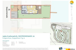 Vor dem Eingang zum Haus haben Sie zwei KFZ-Stellplätze, einen kleinen Vorplatz sowie die ca. 4,5 m² große Gartenhütte. Die gesamte Grundstücksfläche beträgt ca. 318,7 m². Sie betreten die Doppelhaushälfte Seepromenade 29 über einen ca. 7,2 m² großen Vorraum, mit Platz für die Garderobe. Linker Hand finden Sie den Technikraum und das Gäste-WC. Rechter Hand befindet sich ein ca. 6,3 m² großer Abstellraum. Gerade aus gelangen Sie zu einem ca. 10,5 m² großen Schlafzimmer und zum ca. 36,2 m² großen Wohnküchenbereich, der sich zur ca. 21 m² großen Lärchenholzterrasse, dem Garten und zum See hin öffnet. Eine Treppe führt Sie in das Obergeschoss mit drei Schlafzimmern (ca. 10,7 m², 13 m² und etwa 11,7 m²), einem separaten WC, einem ca. 5,6 m² großen Abstellraum mit Waschmaschinenanschluss und dem ca. 7,2 m² große Badezimmer mit Doppelwaschtisch, Badewanne und Dusche.