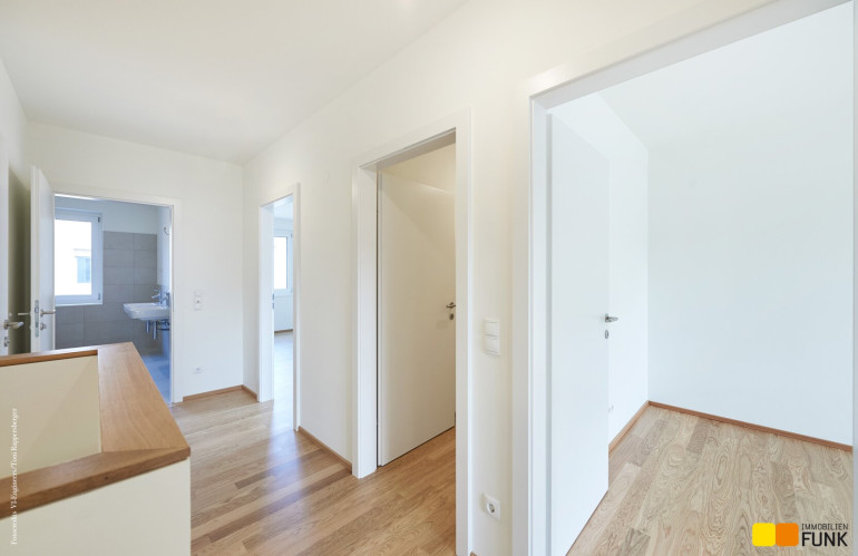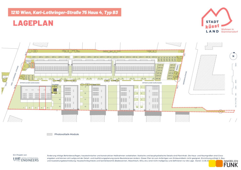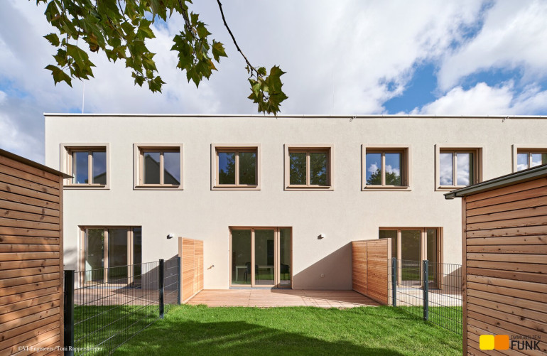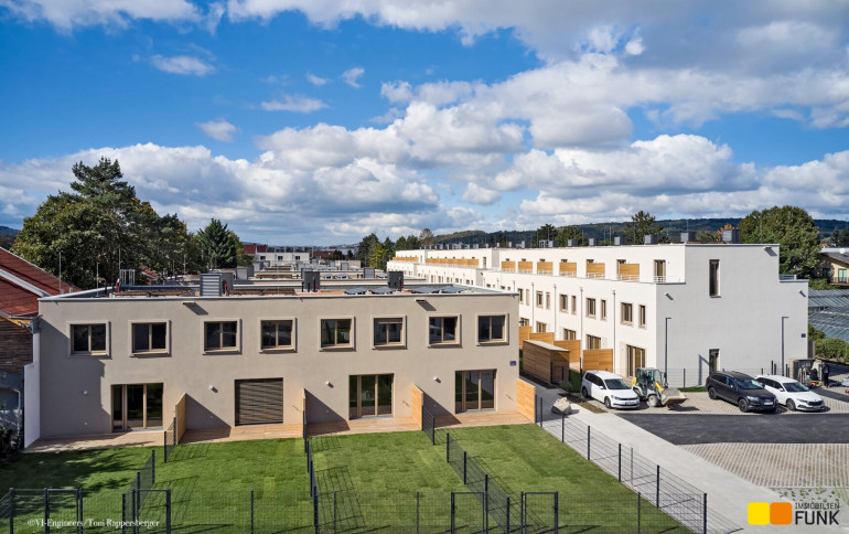 Das soeben fertiggestellte Neubauprojekt „STADT küsst LAND“ ist ein Bauvorhabenvon VI-Engineers Bauträger GmbH & Co KG und entsteht zentrumsnah in Stammersdorf auf einem ca. 10.000 m² großen Areal, eingebettet zwischen Brünner Straße und Jedlersdorfer Straße in 1210 Wien. Es umfasst insgesamt 46 freifinanzierte Reihenhäuser mit Eigengärten und Terrassen sowie 53 zugewiesene PKW-Stellplätze mit nachrüstbarer E-Lademöglichkeit. Ansprechende Grundrisse, eine werthaltige Qualität dank Ziegelmassivbauweise, ein nachhaltiges Energiekonzept mit hauseigener Luftwärmepumpe und Photovoltaik-Anlage am Dach, eine hochwertige Ausstattung wie Fußbodenheizung, außenliegender Sonnenschutz mit Elektroantrieb, Eichenparkettböden und Feinsteinzeug zeichnen zudem das moderne Projekt aus. Alle Bilder: © VI-Engineers/ Toni Rappersberger. Fotos Innenräume: Musterhaus. Machen Sie sich selbst ein Bild- wir führen Sie gerne durch die Häuser.