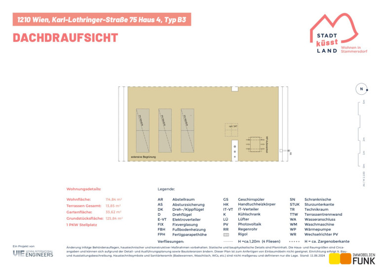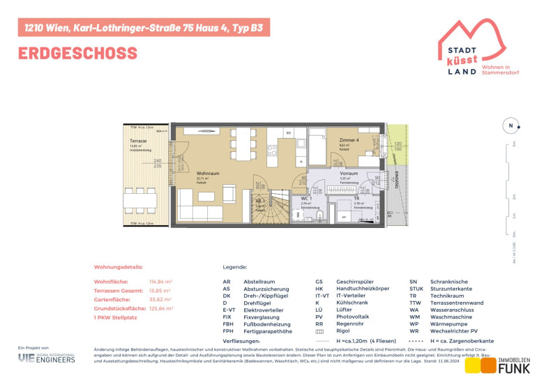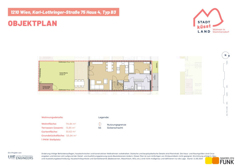 Das Reihenhaus 4 befindet sich in der Karl-Lothringer-Straße 75, 1210 Wien und wird auf einem ca. 126 m² großen Eigengrund errichtet. Seinen künftigen Bewohnern bietet es zudem eine komfortable Wohnfläche im Ausmaß von insgesamt ca. 114 m², angeordnet auf zwei Geschoßen mit 5 Zimmern, 2 Toiletten, einem großen Badezimmer, dem Technikraum und zwei Abstellräumen, sowie einer südseitig ausgerichteten Terrasse mit ca. 13 m², die sich zu einem gemütlichen Gartenbereich mit ca. 34 m² öffnet. Diesem Reihenhaus ist ein Parkplatz in der Nähe des Objekts zugewiesen. Der Kaufpreis für den KFZ-Platz beträgt 19.000,00 € .