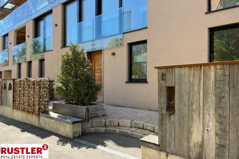 Ein besonderes Highlight dieser Wohnung sind die liebevoll gestalteten Außenbereiche, die ein Gefühl von Freiheit und Naturverbundenheit vermitteln. Für eine optimale Beschattung der westlich ausgerichteten Terrasse sorgt an heißen Tagen eine elektrisch gesteuerte Markise.