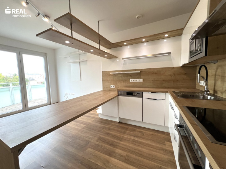 - helles Wohnzimmer inkl. hochwertiger Einbauküche mit sämtlichen Geräten und direktem Ausgang auf den Balkon