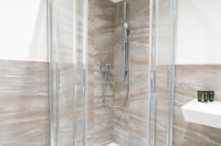 Das moderne Badezimmer ist mit Dusche und WC ausgestattet.