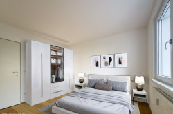 Das Schlafzimmer liegt gegenüber vom Wohnzimmer und direkt neben Ihrer Bad-Oase. Ruhig, großzügig und mit großen Fenstern in den grünen Innenhof – genau richtig für Träume mit Tiefgang.