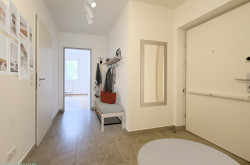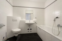 Sie treten ein und gehen wie selbstverständlich weiter – geradeaus befindet sich das komfortable Badezimmer mit einer Wonne-Badewanne, Waschbecken, WC, Platz für Ihre Waschmaschine und – na klar – ein Handtuchtrockner, auf dem Ihr Handtuch schon gedanklich wartet.