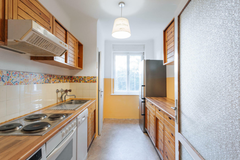 Die Wohnung liegt im ersten Stock (mit Lift). Links vom Vorraum erreicht man das Bad (mit Wanne) und die Küche (mit Abstellkammer), rechts gelangt man in das erste Zimmer und am Ende des Vorraums in das Zimmer mit Balkon. Zwei der drei Zimmer sind über den Vorraum erreichbar, ein Durchgangszimmer (mit französischem Balkon).