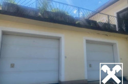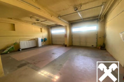 Wohn/Gewerbehaus in Eltendorf mit 6 Garagen im Erdgeschoß (Raumhöhe ca. 3,70 m) und großer asphaltierter Fläche seitlich des Gebäudes.