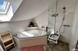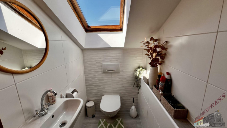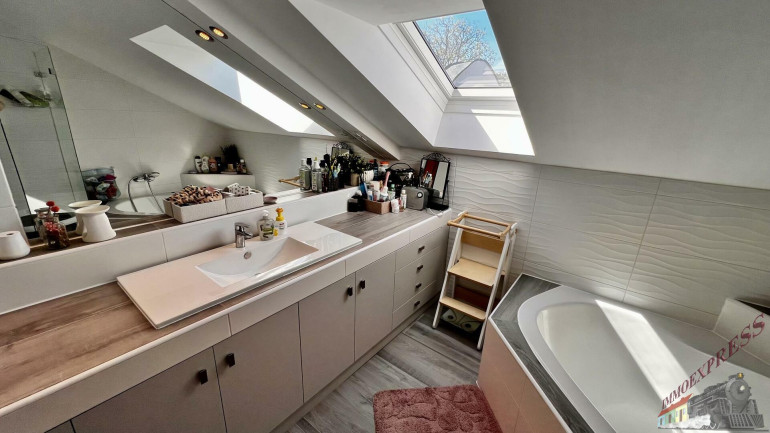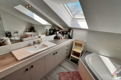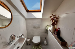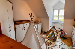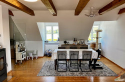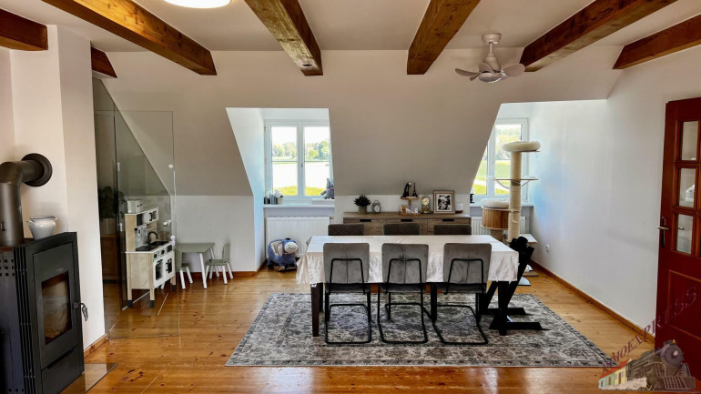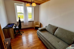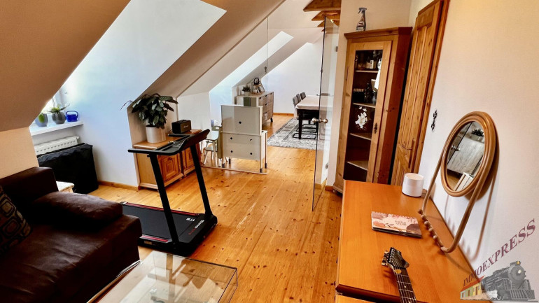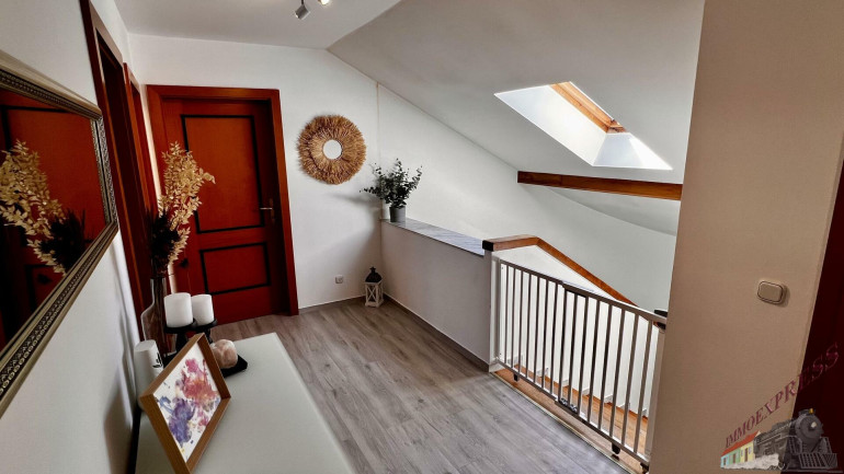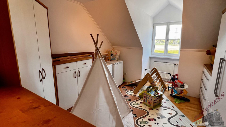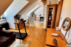 Das lichtdurchflutete Obergeschoss mit ca. 147 m² Wohnfläche versprüht durch seine Dachschrägen und die rustikalen Holzbalken an der Decke einen unvergleichlichen Charme. Über den Stiegenaufgang gelangen Sie in den Vorraum mit Zugang zu 3 zentral begehbaren Schlafzimmern und der vollausgestatteten Einbauküche. Vom riesigen Wohnzimmer mit dem durch eine Glaswand abgetrenntem Büro/Fitnessraum mit einem weiteren angeschlossenen Zimmer eröffnet sich Ihnen der ca. 14m² große Sonnenbalkon mit Blick auf den topgepflegten Garten mit u.a. Äpfel- und Zwetschgenbäumen, Wiesen und Feldern - einfach perfekt für die nahende Chill- und Grill-Saison. Ebenfalls im Dachgeschoss befinden sich zudem 2 Badezimmer, ein separates WC und 2 Abstellräume. Die zum großen Teil 3-fach verglasten Kunststofffenster verfügen zum Teil über Fliegenschutz und Sonnenschutz und bieten entsprechend zeitgemäßen Komfort.
