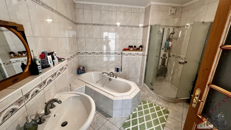 Die Wohnung im Erdgeschoss mit ca. 157 m² Wohnfläche begehen Sie über einen wintergartenartigen Vorraum und gelangen sodann durch den Flur in den großzügigen Wohnbereich mit Ausgang auf die ca. 30 m² große Terrasse, die Einbauküche mit angeschlossenem Esszimmer und insgesamt 2 weiteren Zimmern, sowie einem Schrankraum. Der anschließende Flur führt Sie in das Haupt-Badezimmer mit Eckbadewanne und Duschkabine, sowie in 2 weitere als Schlafräume nutzbare Zimmer. Auf dieser Ebene befinden sich überdies ein separates WC, ein kleines Badezimmer und eine Speis.