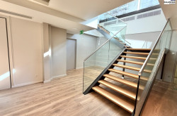 Eine breite Stahl-Glas-Treppe führt ins Untergeschoss (ca. 50 m²): ein rechteckiger Verkaufs-/Präsentationsraum (ca. 50 m²) und ein Ausgang/Fluchtweg zum gemeinsamen Treppenhaus.
