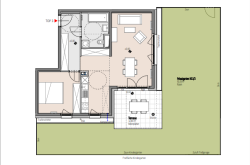 Auf rund 60 m² Wohnfläche bietet diese 2-Zimmer-Wohnung ein Wohnzimmer, Küche und Schlafzimmer. Die Terrasse mit über 12 m² und der angrenzende Garten mit rund 92 m² laden zu entspannten Stunden im Freien ein.