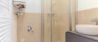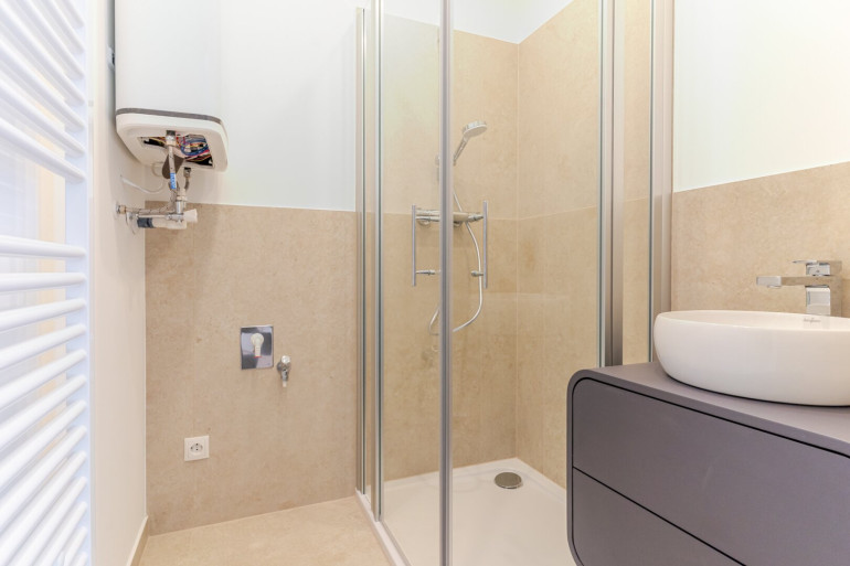 Modernes Bad mit Dusche und Anschluss für Waschmaschine