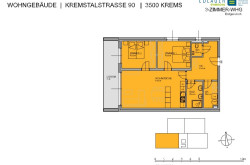 Die im EG befindliche Mietwohnung weist eine Gesamtnutzfläche von ca. 89,83 m² auf und gliedert sich wie folgt: Vorraum, Wohnküche, zwei Schlafzimmer, Badezimmer, Loggia, Abstellraum und WC.