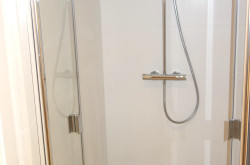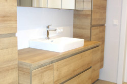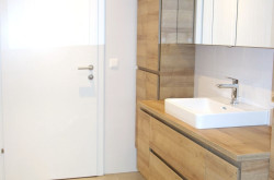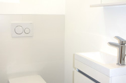 – Großformatfliesen in Badezimmer/WC mit moderner Sanitärausstattung