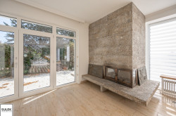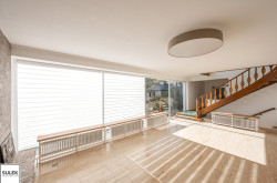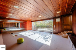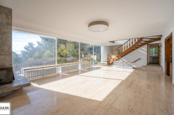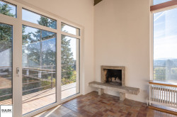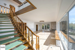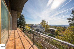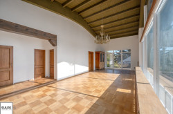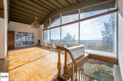 Im Obergeschoss befindet sich der zweite große und ebenso lichtdurchflutete Wohnbereich, welcher vor allem durch die offene Glasfront mit Blick ins Grüne besticht. Auch im Obergeschoss ist ein offener Kamin vorhanden. Zudem gelangen Sie direkt zum angrenzenden Südostbalkon, welcher einen phänomenalen Ausblick bietet. Weiters im Obergeschoss befinden sich zwei Bäder, ein separates WC, sowie vier weitere Wohnräume / Schlafzimmer, wovon eines über einen praktischen Schrankraum verfügt.