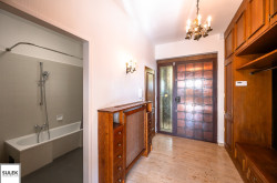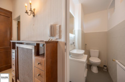 Im Erdgeschoss befindet sich einer der beiden großen Wohnbereiche mit offenem Kamin, anschließendem Esszimmer und direkt begehbarer, östlich ausgerichteter Steinterrasse. Die Terrasse verfügt über eine praktische Markise und lädt an warmen Sommertagen zum Frühstück mit der Familie ein. Ebenfalls im Erdgeschoss finden Sie eine separate, voll ausgestattete Küche mit Speisekammer, sowie zwei kleine Zimmer, eine separate Toilette und ein Badezimmer.