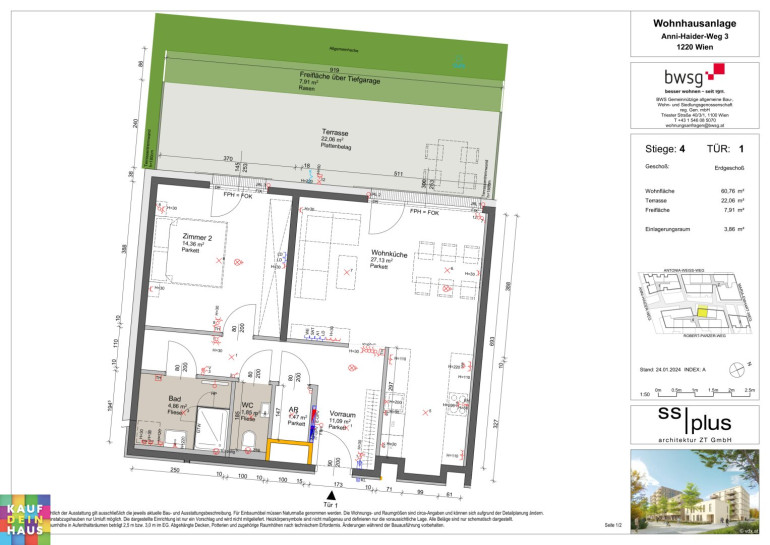 Ein Tiefgaragenplatz kann zusätzlich um € 29.202,45,- erworben werden. Begrenzte Stückzahl vorhanden!