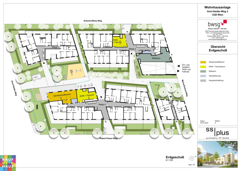 Die Wohnhausanlage setzt sich aus vier Gebäudeblöcken mit unterschiedlichen Höhen zusammen. Sie zeichnet sich durch geräumige Wohnungsgrundrisse und großzügige Freiflächen aus. Es gibt eine Garage, Einlagerungsräume, Kinderwagen- und Fahrradräume, einen geräumigen Gemeinschaftsraum für Ihre Partys sowie hauseigene Spielplätze.