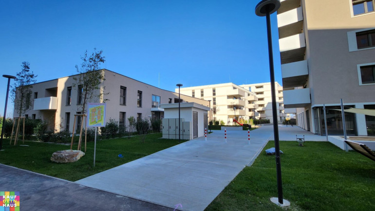Die Wohnhausanlage setzt sich aus vier Gebäudeblöcken mit unterschiedlichen Höhen zusammen. Sie zeichnet sich durch geräumige Wohnungsgrundrisse und großzügige Freiflächen aus. Es gibt eine Garage, Einlagerungsräume, Kinderwagen- und Fahrradräume, einen geräumigen Gemeinschaftsraum für Ihre Partys sowie hauseigene Spielplätze.