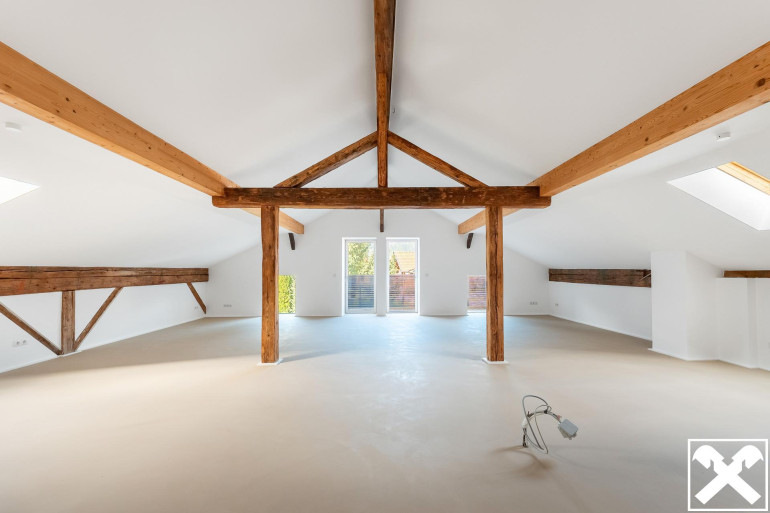 Auf rund 178 m² Wohnfläche erwartet Sie ein außergewöhnlich großzügiger Wohnraum mit sichtbaren Holzbalken, weitläufigen Fensterfronten und einem beeindruckenden Raumgefühl.