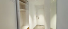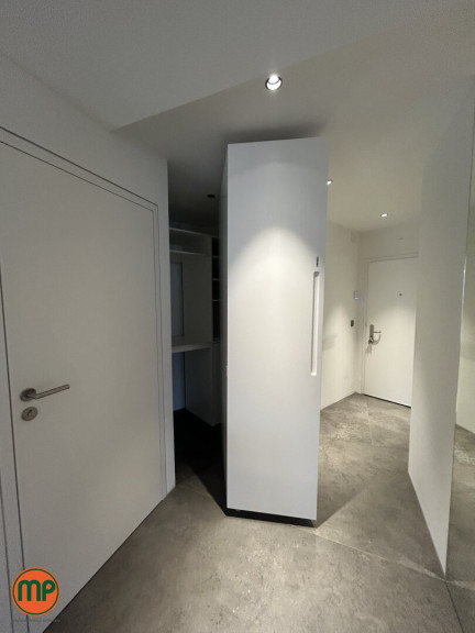 Die Waschmaschine ist geschickt hinter einer beweglichen Garderobe verborgen – ein Beispiel für die clever integrierten Stauraumlösungen, die in der gesamten Wohnung umgesetzt wurden.