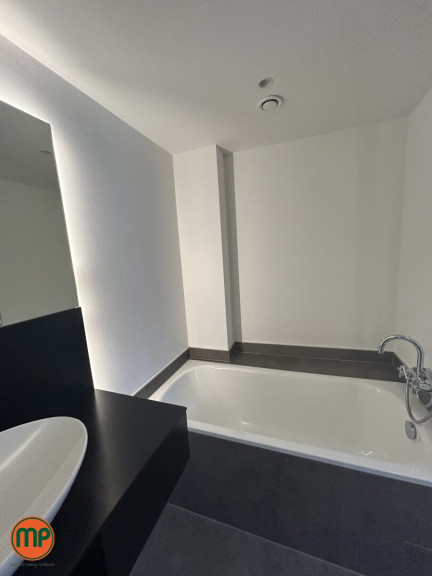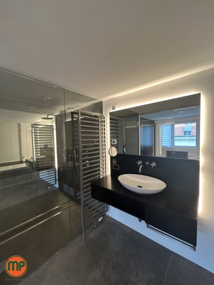 Das en-suite Badezimmer, das über eine elegante Schiebetür zugänglich ist, präsentiert sich als wahre Wohlfühloase. Es ist mit einer freistehenden Badewanne, einer komfortablen Walk-in-Dusche sowie hochwertigen Sanitärelementen von Villeroy & Boch ausgestattet – ein Ausdruck von Stil, Qualität und zeitgemäßer Ästhetik.