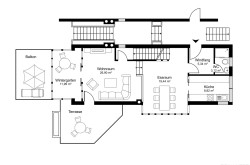 Im Erdgeschoss bildet der großzügige Wohn- und Essbereich mit offenem Kamin und anschließender Küche den Mittelpunkt des Hauses. Große Glasflächen und der vorgelagerte Wintergarten verbinden Innen- und Außenraum auf harmonische Weise und schaffen ein helles, einladendes Ambiente. Im Obergeschoss befinden sich drei Schlafräume, ein Schrankraum und ein Badezimmer mit Badewanne, Dusche und Doppelwaschtisch. Das Dachstudio ergänzt die Wohnfläche um einen hellen, offenen Raum, der sich ideal als Büro, Atelier oder Rückzugsbereich eignet.
