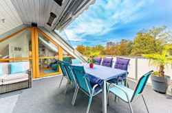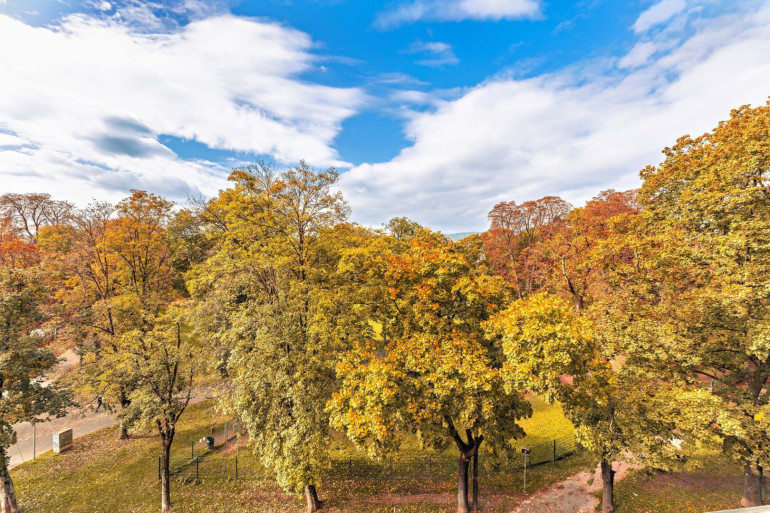 Die Wohnung erstreckt sich über zwei Ebenen und bietet rund 126 m² Wohnfläche (laut Nutzwertgutachten). Ein besonderes Highlight ist die ca. 30 m² große, westseitig ausgerichtete Dachterrasse mit Blick auf die Baumkronen des Augartens. Dank transparenter Winterplane ist eine Nutzung auch in den kühleren Monaten möglich.