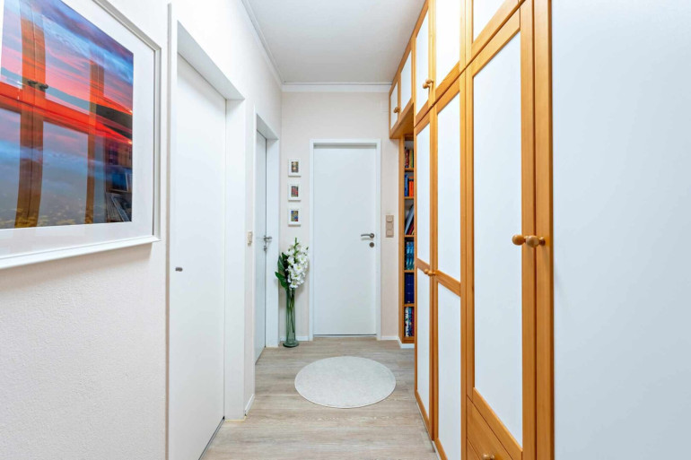 Der Eingangsbereich verfügt über einen Vorraum mit Gäste-WC und praktischem Abstellraum. Von hier gelangt man in den offen gestalteten Wohn- und Essbereich mit angrenzender, 2020 erneuerter Küche, der das Herzstück der Wohnung bildet. Auf dieser Ebene befinden sich zudem ein separater Schlafbereich mit Einbauschränken, ein großzügiges Schlafzimmer mit begehbarem Schrankraum, ein weiteres Zimmer – ideal als Kinder- oder Arbeitszimmer – sowie das moderne Tageslichtbad, das 2022 erneuert wurde. Das ursprüngliche Innenbad wurde in einen funktionalen Wäscheraum mit zusätzlichem WC umgebaut.