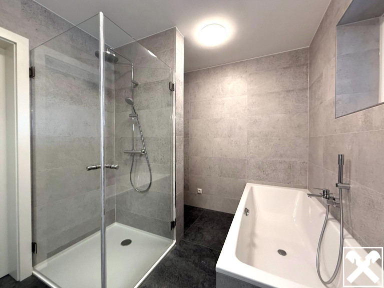 - Badezimmer mit Fenster, Wanne, Dusche und WC
