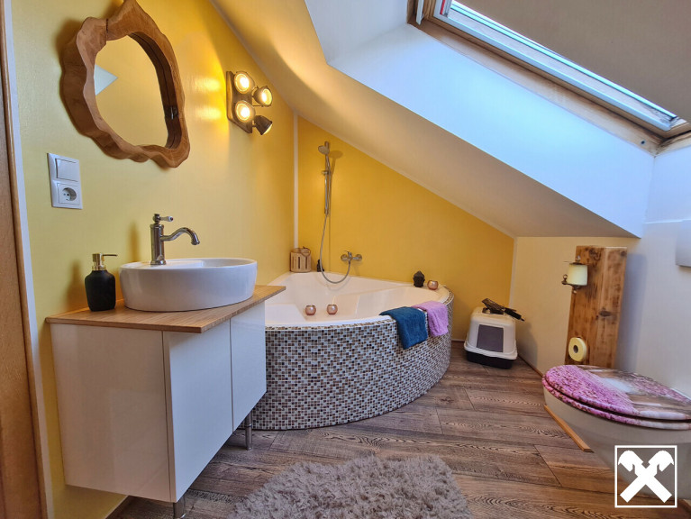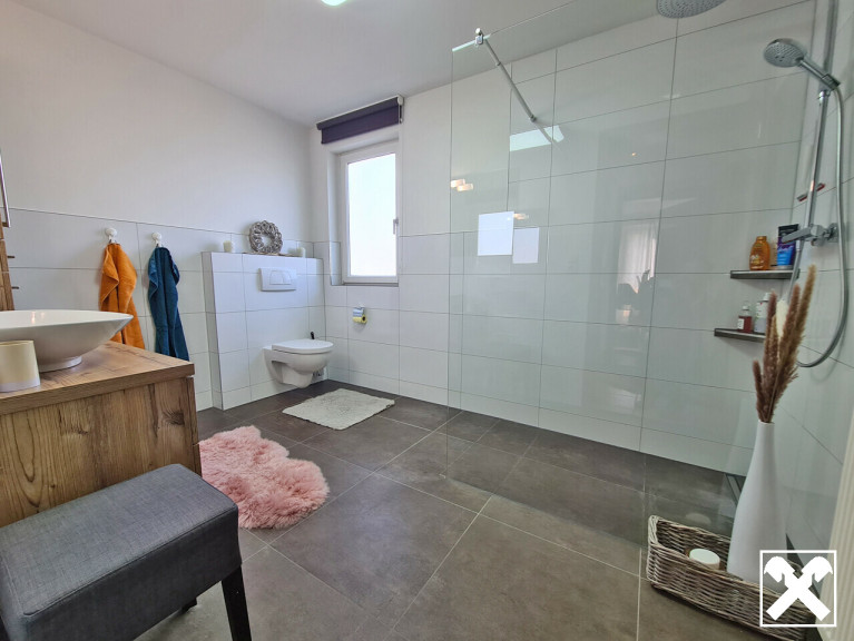 • Komplett saniertes Badezimmer mit bodenebener Dusche im Obergeschoss