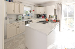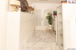 Im Erdgeschoss befindet sich der zentrale Wohn- und Essbereich mit angrenzender Küche. Französische Fenstertüren öffnen den Raum zur Terrasse und verbinden das Innere mit dem Garten – ein Ort, an dem sich das Familienleben ebenso entfalten kann wie gesellige Abende mit Freunden. Die großzügige Diele empfängt Bewohner und Gäste mit Böden aus herrlichem Carrara-Marmor. Ein Gäste-WC ergänzt diese Ebene funktional und stilvoll.