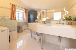Im Obergeschoss setzt sich das Gefühl von Großzügigkeit fort. Zwei Schlafräume mit optimaler Belichtung schaffen Rückzugsorte mit Grünblick. Ein weiteres Zimmer wird derzeit als Fitnessraum genutzt und kann rasch als drittes Schlafzimmer oder Büro adaptiert werden. Das Hauptbad überzeugt mit klarer Linienführung, Doppelwaschtisch, Dusche und eine großzügige Eck-Badewanne. Von den Schlafräumen gelangt man auf den vorgelagerten Südbalkon, der den Blick über den eigenen Garten und die angrenzende Grünlandschaft öffnet – ein Platz, an dem der Tag ruhig beginnen und entspannt ausklingen darf.