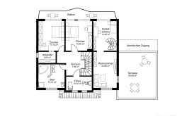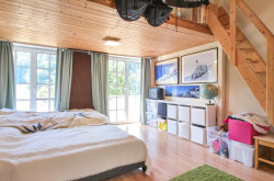 Im Erdgeschoss dieses Trakts liegen die Küche und das Badezimmer. Der südorientierte Wohnbereich verfügt über einen direkten Ausgang auf die Terrasse und in den Garten. Über eine gewendelte Treppe erreicht man das Obergeschoss, wo zwei weitere Zimmer miteinander verbunden sind: eines mit Balkonzugang nach Süden, das andere mit dem Zugang zu einer großzügigen Terrasse oberhalb der Garage. Diese Kombination aus Eigenständigkeit und Nähe zum Haupthaus macht den Trakt zu einer wertvollen Erweiterung – sowohl privat als auch beruflich nutzbar. Der nachträgliche Einbau eines Liftes ist möglich und wurde bei der Planung von vorneherein berücksichtigt.