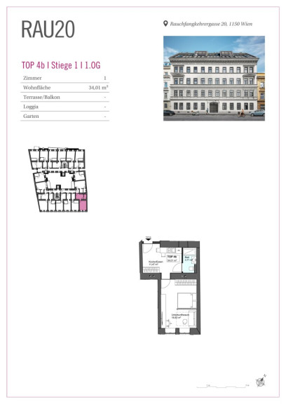 Das Gründerzeithaus in der Rauchfangkehrergasse 20 in unmittelbarer Nähe zu Schönbrunn besteht aus einem Straßen- und einem Hofgebäude. Die Liegenschaft wird umfassend saniert, durch eine Aufstockung ergänzt und mittels Dachbodenausbau erweitert. In den Regelgeschossen entstehen Serviced Apartments, deren Grundrisse gezielt auf die Anforderungen der Kurzzeitvermietung abgestimmt sind und die über eine Beherbergungswidmung samt rechtskräftiger Betriebsanlagengenehmigung verfügen. Die Dachgeschossbereiche werden als klassische Wohnungen ausgeführt.