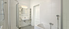 Das Bad ist voll ausgestattet mit Badewanne und Dusche, Waschbecken, WC und Bidet). Die Wohnung verfügt außerdem über ein separates WC mit Handwaschbecken.