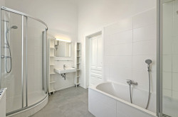 Das Bad ist voll ausgestattet mit Badewanne und Dusche, Waschbecken, WC und Bidet). Das Büro verfügt außerdem über ein separates WC mit Handwaschbecken.