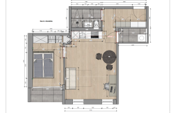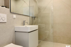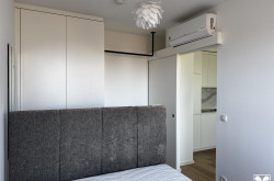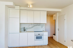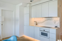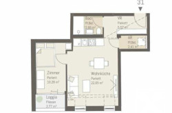 Die 45m² sind optimal angelegt: Wohnküche mit moderner Einbauküche und Platz für Eßtisch, Couch und Arbeitsbereich, daneben das Schlafzimmer mit Einbauschrank und Ausgang auf die Loggia, ein geschmackvolles Bad mit bodenebener Dusche, Abstellraum mit Anschluß für die Waschmaschine und ein schöner Vorraum mit Garderobe.